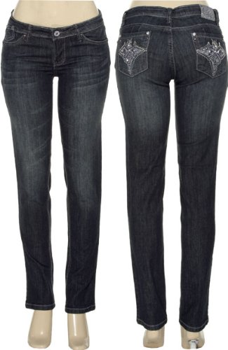 H&G dark stonewashed jeans feature custom faux rhinestone and diamond studded back pockets with sequins outlining the top of the design. This five-pocket zip fly skinny jean has light whiskers at the hips and fading down the thighs. Inseam measures approximately 31 1/2" long.