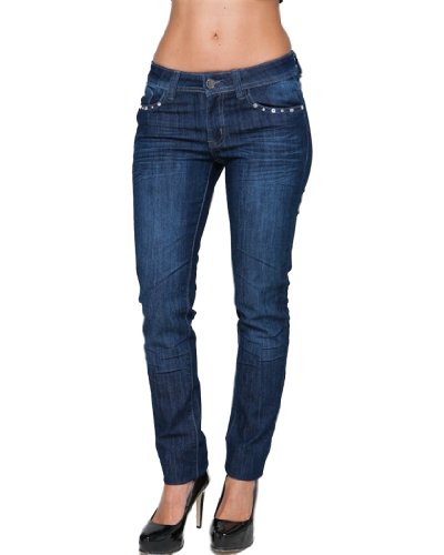 - low rise, belt loops around the waistline, 5 pockets with back pleats and rhinestone details, gem rivets, zipper fly, and single button tab closure