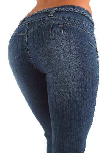 Silver Diva Stretch Push-Up Jeans (Levanta Cola) Skinny jeans Designed in Colombia, these super stretch jeans in washed color are both slimming and fashionable, Beautiful flower embroidery and crystals with braid belt like design, 2 crystal buttons on a wide designed waistband makes your tummy looks flatter, 2 front fake pockets with crystal rivets and design, no back pockets, the additional arched stitching in the back rises over your rear and hugs your hips to create the butt lifting effect.