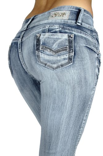 Silver Diva Stretch Push-Up Jeans (Levanta Cola) Skinny jeans Designed in Colombia, these super stretch gorgeous jeans in Washed medium Denim color are both slimming and fashionable, 2 Crystal buttons on a wide waistband makes your tummy looks flatter, front feature fabric design with embroidery and silver studs design, back pockets with classic embroidery, the additional arched stitching in the back rises over your rear and hugs your hips to create the butt lifting effect. Great fabric in top q