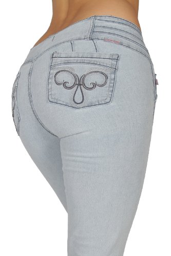 This Butt lifting Colombian style Skinny Leg denim is made of top quality Peruvian Cotton and features three buttons on extended waistband. Two back pockets with embroidery. Front of jeans has two fake pockets design. The additional arched stitching in the back rises over your rear and hugs your hips to create the butt lifting effect with great look and fit.