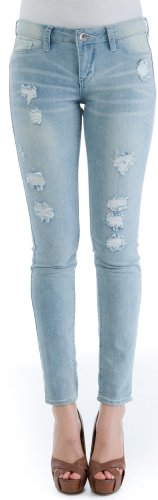 The Destructed Rocker Skinny is a fitted skinny jean in a light denim wash with distressing, destruction, sandblasting, and heat-set whiskering. Skinny low rise jean with ultra slimming capabilities scientifically designed by denim technologists at dollhouse denim labs. Dont be a Wallflower - wear jeans that make you shine!